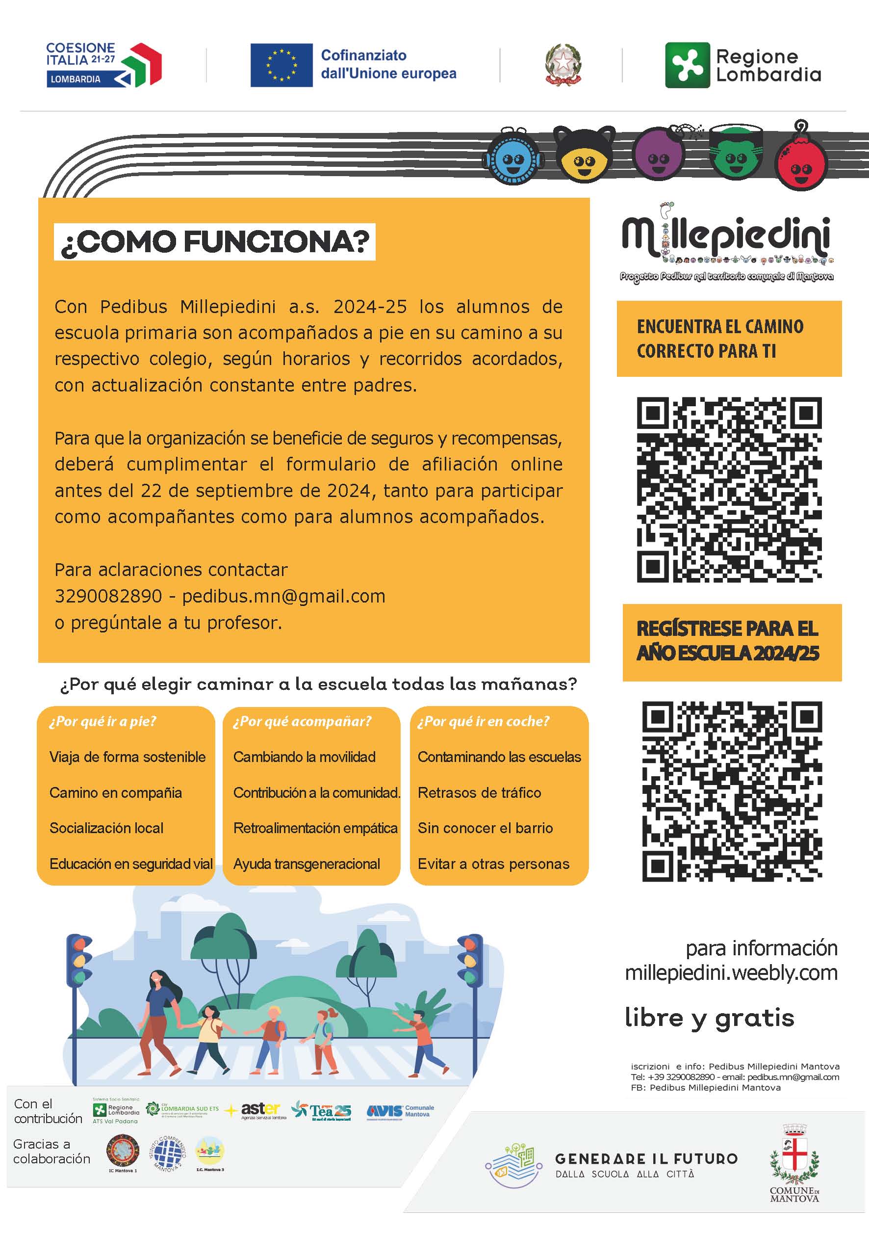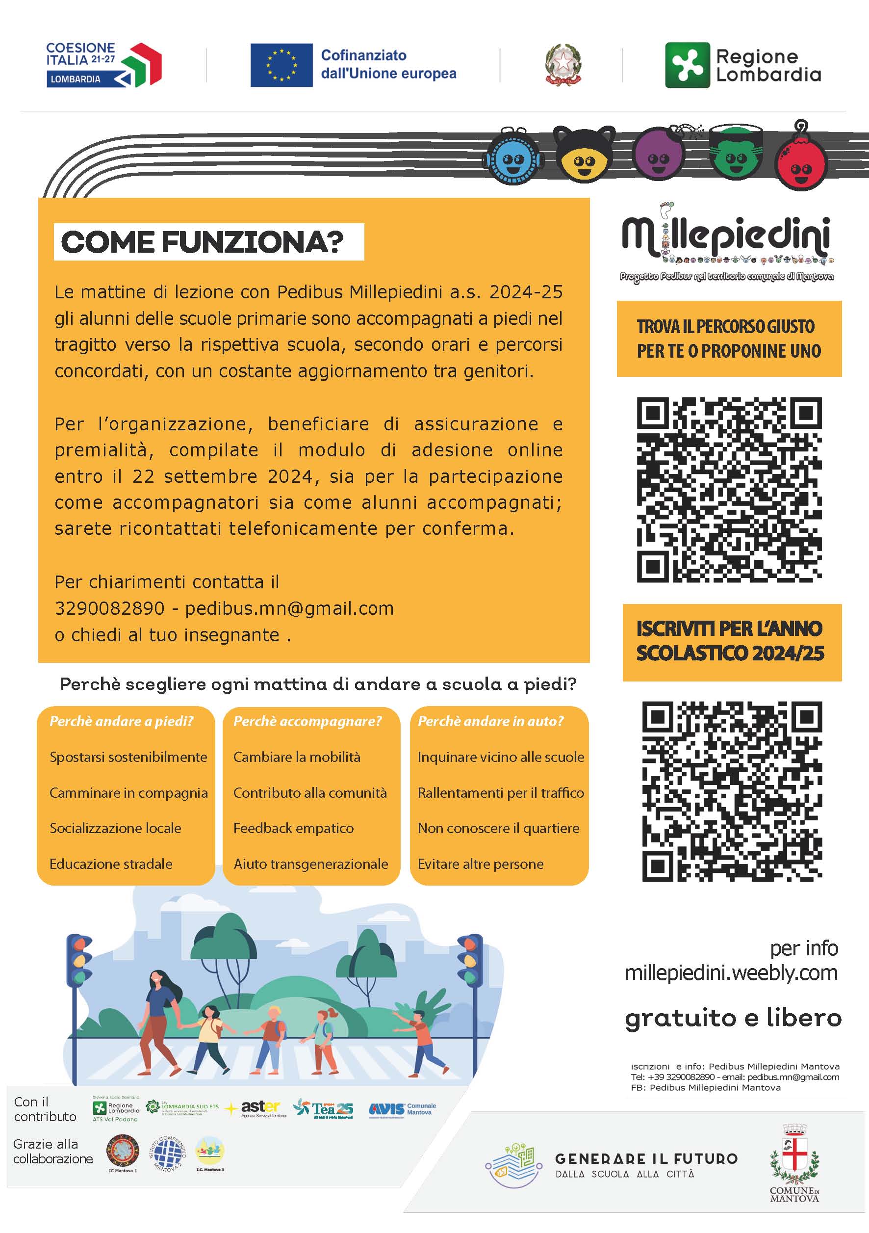 Il Progetto Pedibus Millepiedini consente ai bambini delle scuole primarie di recarsi a scuola a piedi assieme, e con accompagnamento assistito di adulti volontari, seguendo, da punti di raccolta identificati, percorsi sicuri.